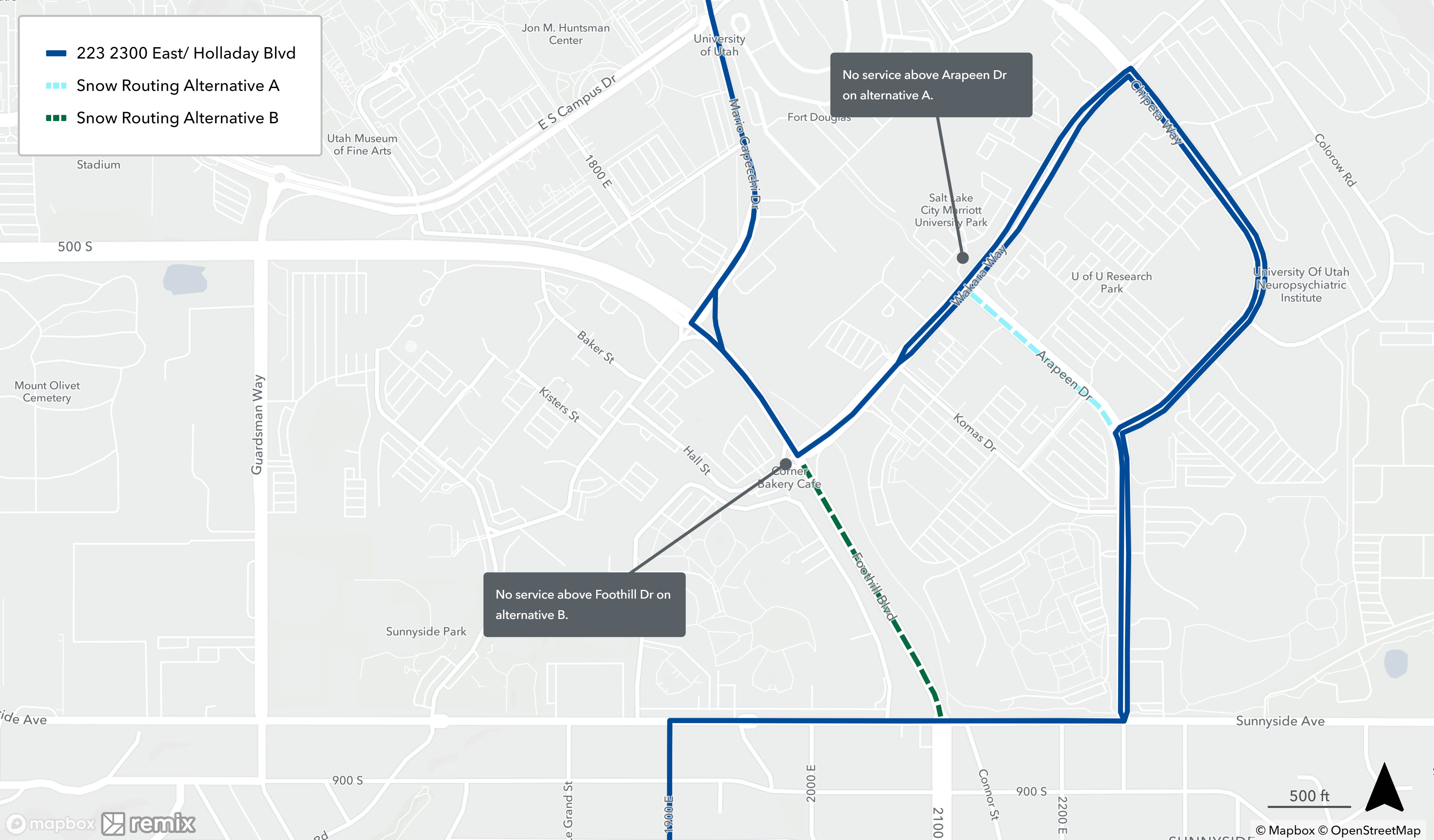 Snow routing occurs when UTA buses are unable to follow their regular route due to inclement weather. If there is a substantial amount of snow or ice on the roads, buses will avoid steep hills in favor of safer routes. Snow routing only affects select UTA bus routes and stops and is only put into place during or immediately after severe weather. Once roads are cleared, buses will resume their regular routes.