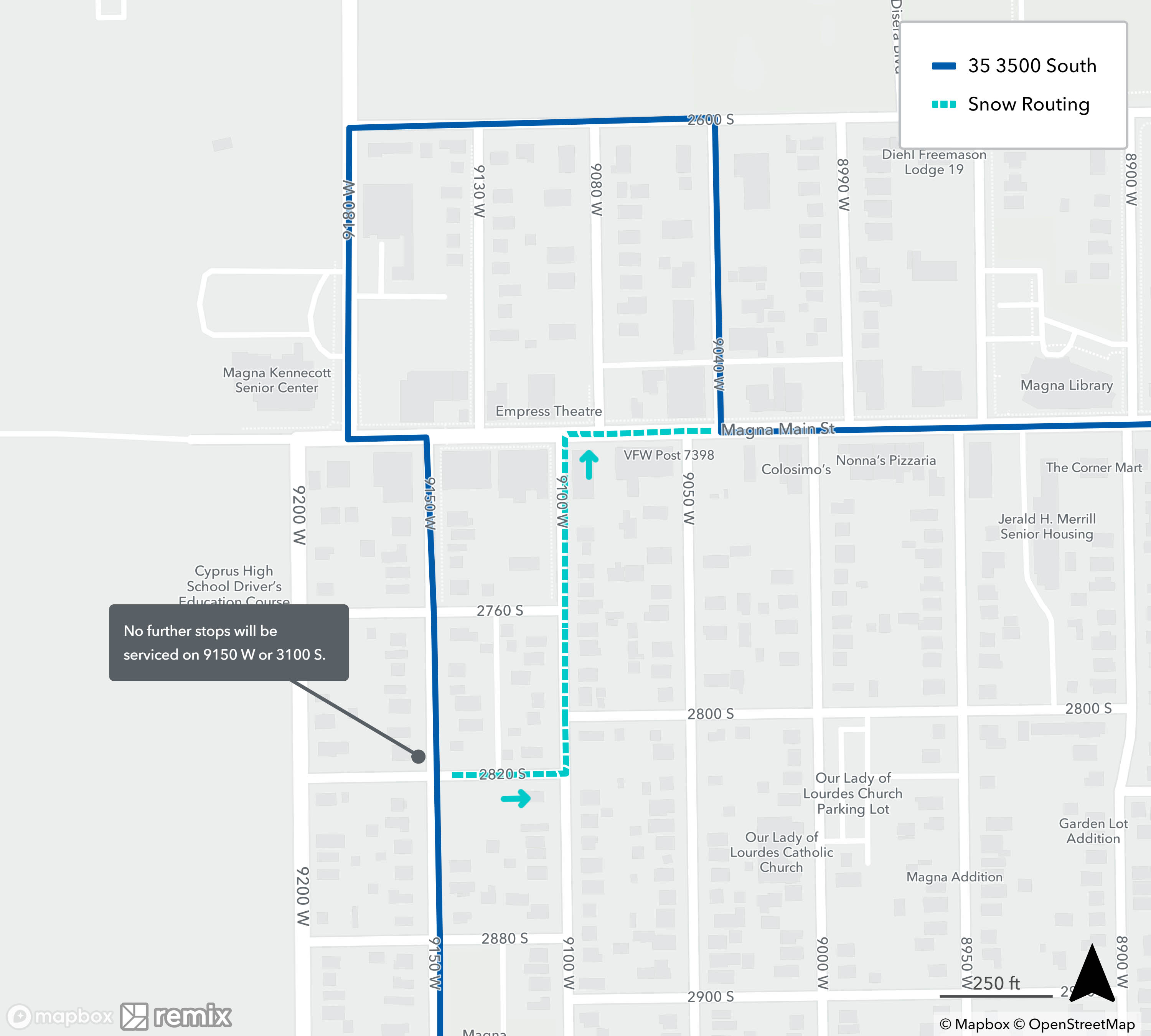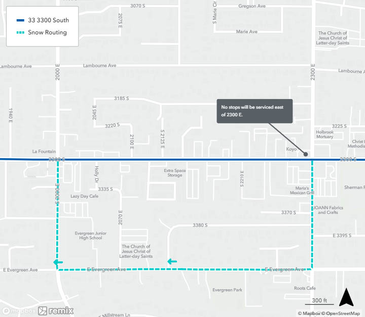 When a bus is on snow routing, it will detour from its regular route. You may need to catch your bus at a different location during this time. See below to find your route’s specific snow routing map to determine where to catch the bus. If you need assistance, please call 801-743-3882 or contact us on Twitter at @RideUTA or sign up to receive route-specific notifications.